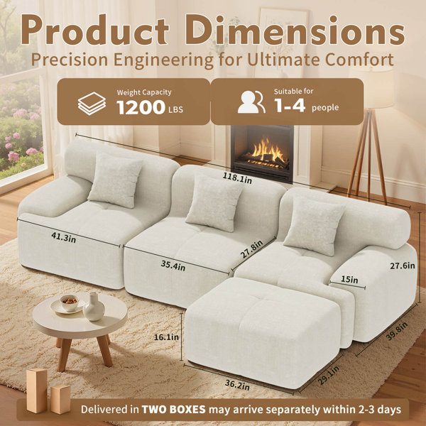 - Spacious & Versatile Design : Enjoy generous lounging with our modular sofa’s 118-inch width and deep seats. Its stylish, adaptable design fits any room—living room, bedroom, or home office—offering the perfect cozy spot for family and guests