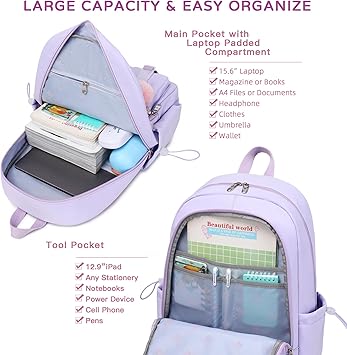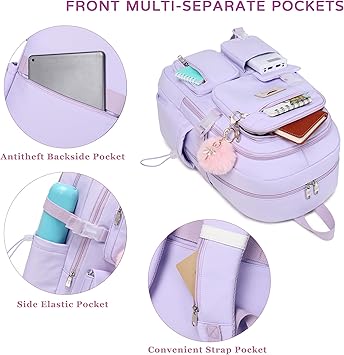 - 【Multi-compartments & Large Capacity 】: The travel backpack for women has 7 separate different compartments and two side elastic pockets. The front three pockets can hold charge device and other small items. The main compartment of includes laptop padded sleeve with elastic belt. The front tool compartment also come with multiple pockets to provide roomy space for necessities . The back zipper pocket can protect your important items from theft.